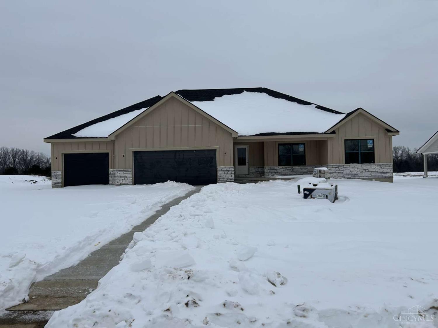 Stunning new custom home featuring premium finishes and a spacious 2,800 SF open floor plan. This 4-bedroom, 3-bath design showcases exceptional craftsmanship, including European White Oak hardwood flooring throughout the kitchen, great room, breakfast nook, dining room, entry, hallways, and baths. The gourmet kitchen features 48 white shaker cabinets, quartz countertops, subway tile backsplash, and a 5' island counter bar ideal for entertaining. The great room offers a cathedral ceiling and an electric linear fireplace with wood panel surround. The luxurious primary suite includes a wood tray ceiling, walk-in closet, and large tile shower. Oversized white trim, baseboards, and 2-panel plank doors create a clean, modern look. The partially finished basement includes a 9' wet bar, 4th bedroom, and additional living space. A 4-car garage provides ample storage and parking. Enjoy outdoor living on the 22' x 10' covered concrete patio.