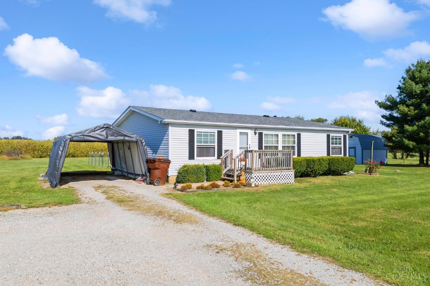 Welcome Home to the Country! Enjoy peaceful country living with this well-cared-for 3-bedroom, 2-full-bath manufactured ranch home situated on 2 acres, offered as two separate 1-acre parcels. The spacious living room with built-in shelving and vaulted ceiling is the perfect place to relax, while the eat-in kitchen (with range and refrigerator included) makes gathering easy. A convenient laundry room offers a walkout to the rear yard. Outside, there's plenty of space to enjoy the outdoors, along with a storage shed for mowers and lawn equipment, plus a detached canvas carport that conveys at closing. Over the years, the home has seen many updates, including windows, HVAC, roof, LVT flooring, setting with the added bonus of quick access to I-71 for an easy commute. Home being sold in its "as is" condition.